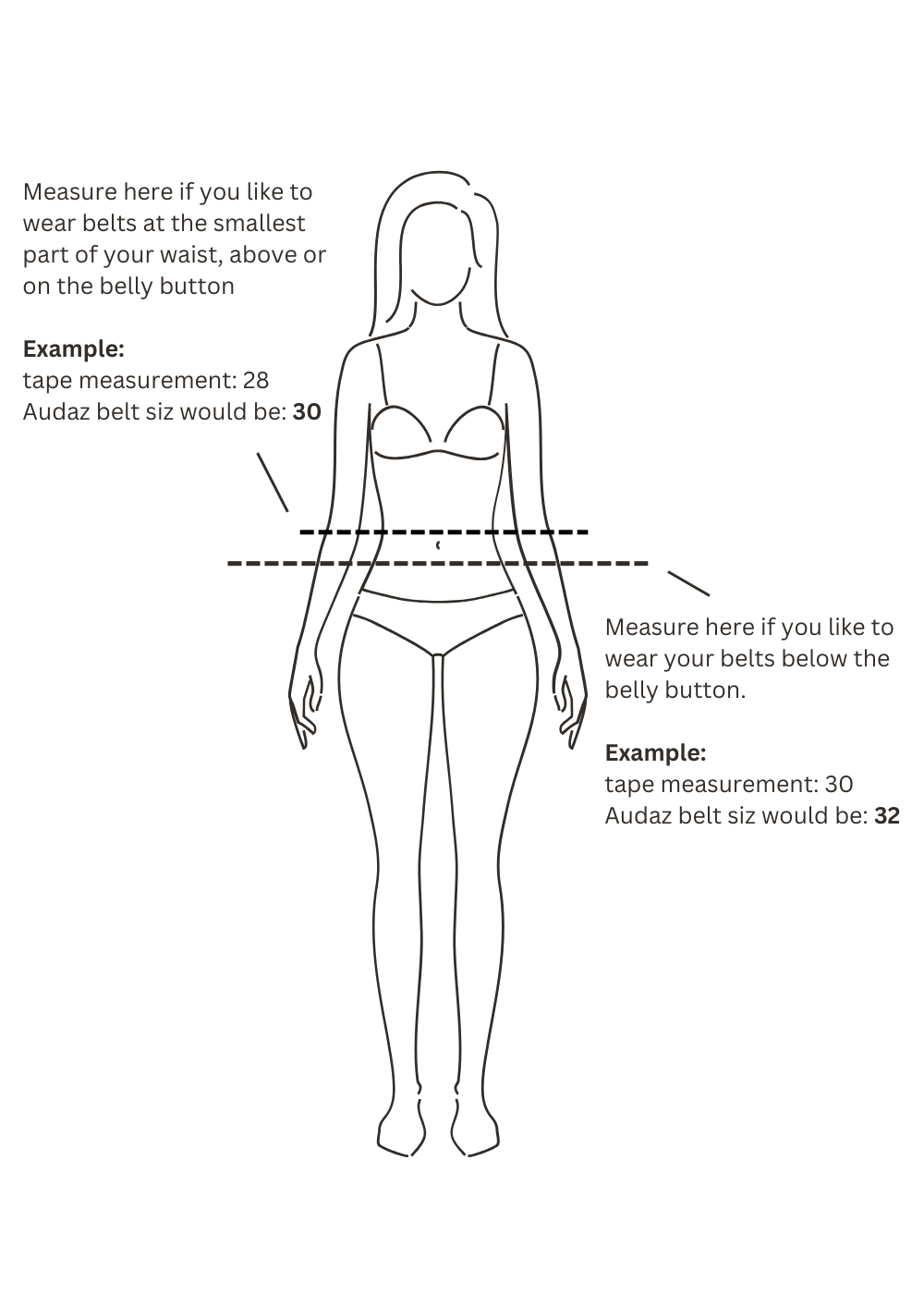 - Whether you prefer to wear your belts on your hips or waist, measure with a tape measure on your natural skin using the 'inches' side up.
