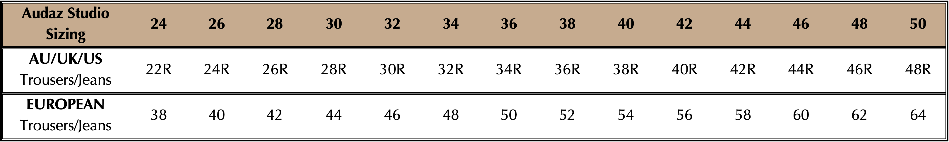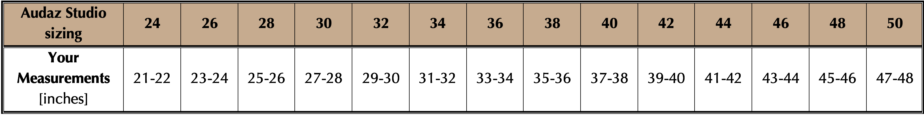 - Once located, the box at the top of the chart will show the recommended Audaz Studio belt size.
